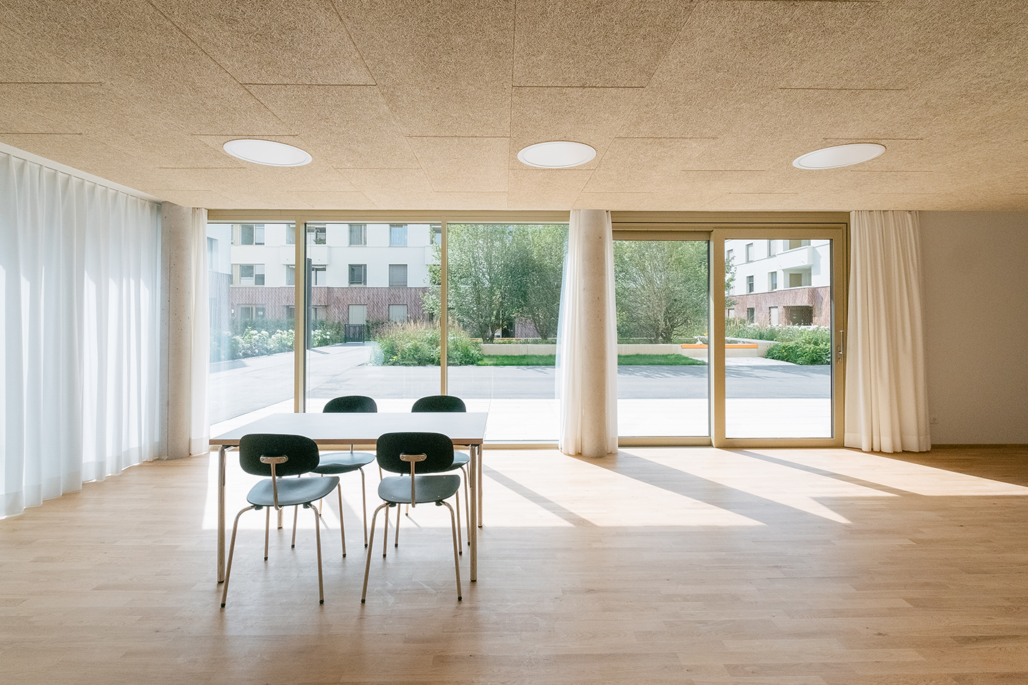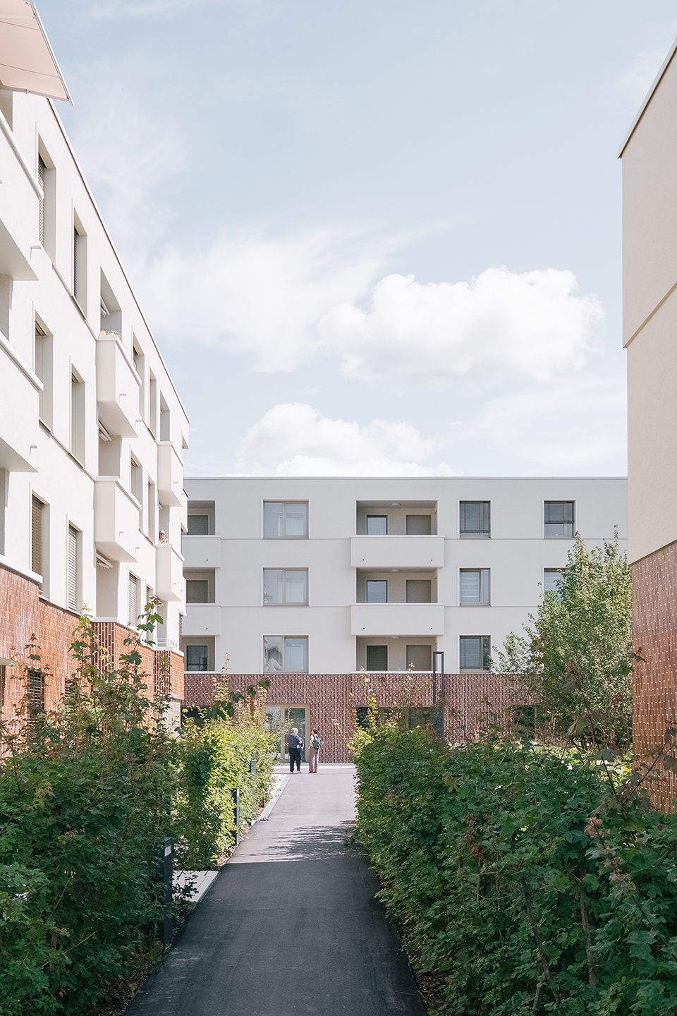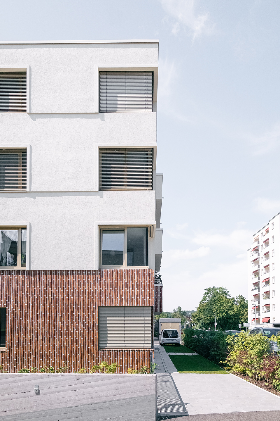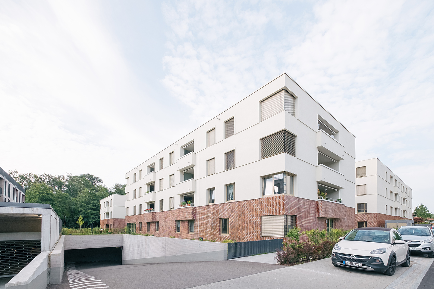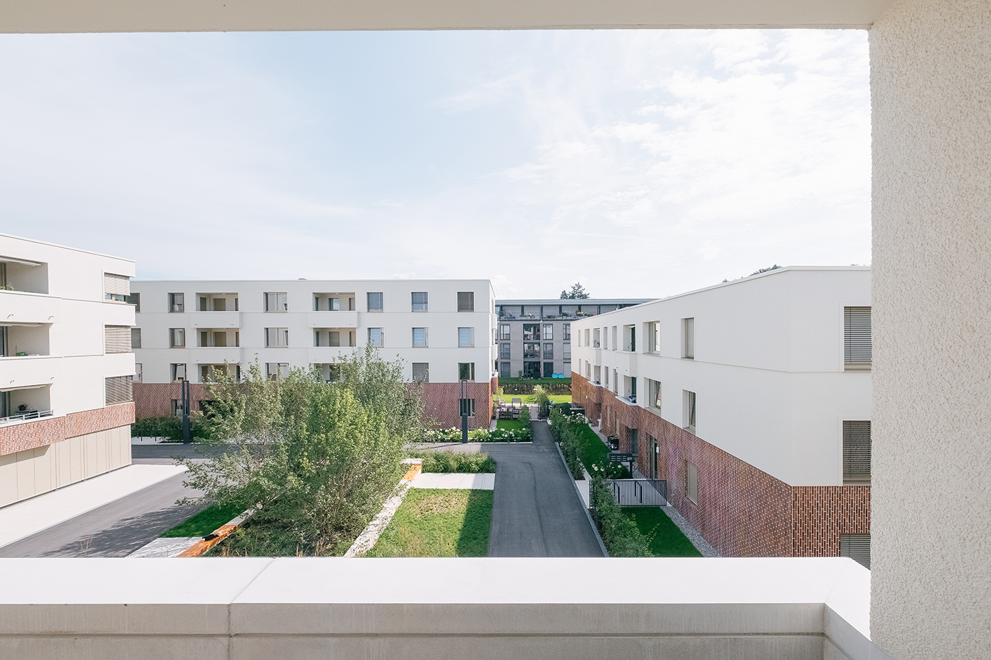„In den zwei dreigeschoßigen und zwei viergeschoßigen Baukörpern im süddeutschen Lörrach/Schopfheim werden alle Wohnungen über einen lärm- und sichtgeschützten Gemeinschaftshof erschlossen und sind dennoch mit der Umgebung harmonisch verzahnt.“ - Schenker Salvi Weber
