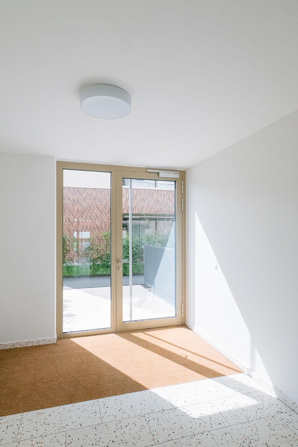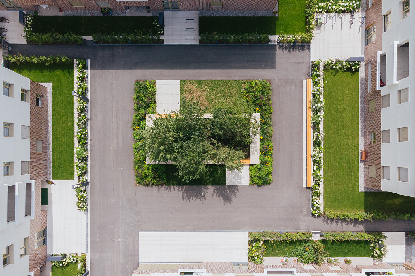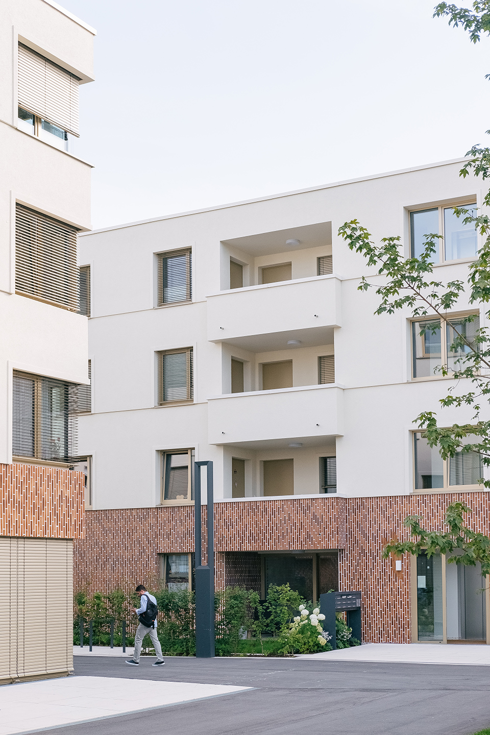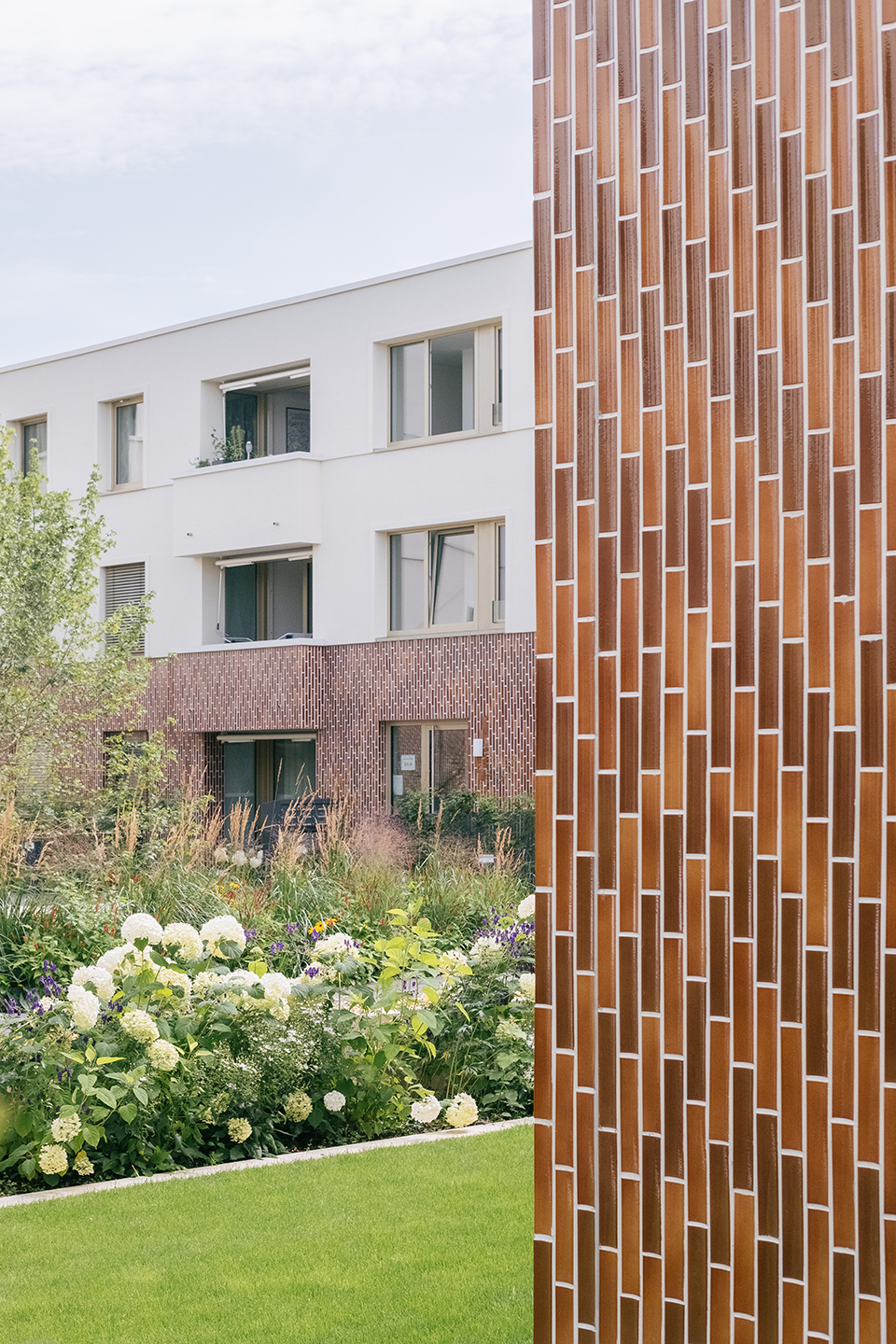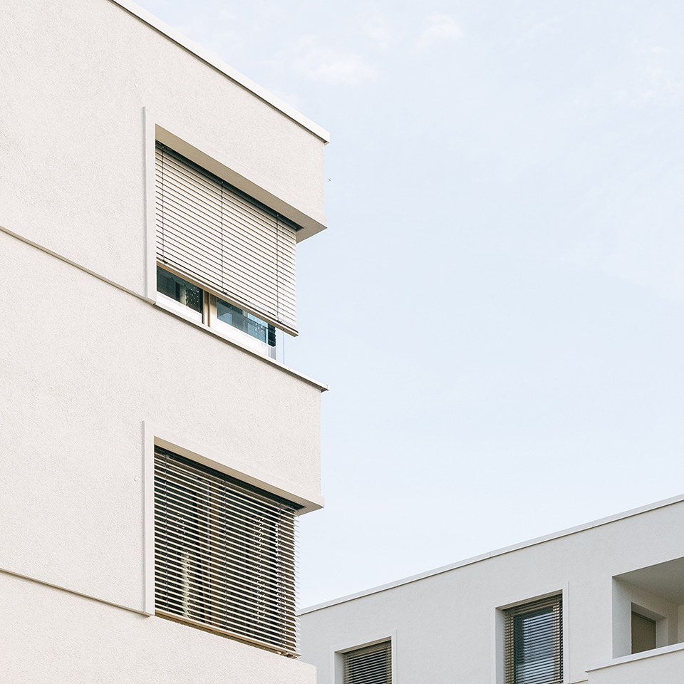 „In den zwei dreigeschoßigen und zwei viergeschoßigen Baukörpern im süddeutschen Lörrach/Schopfheim werden alle Wohnungen über einen lärm- und sichtgeschützten Gemeinschaftshof erschlossen und sind dennoch mit der Umgebung harmonisch verzahnt.“ - Schenker Salvi Weber