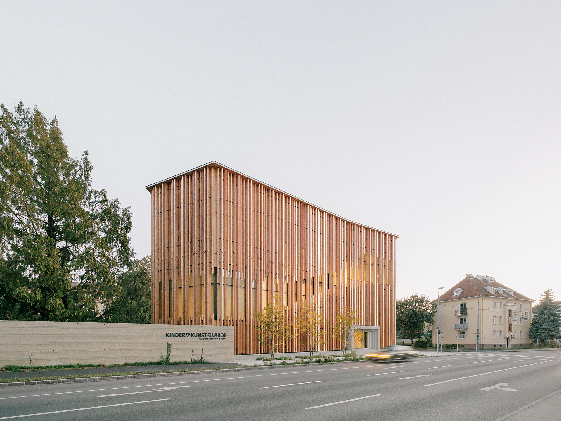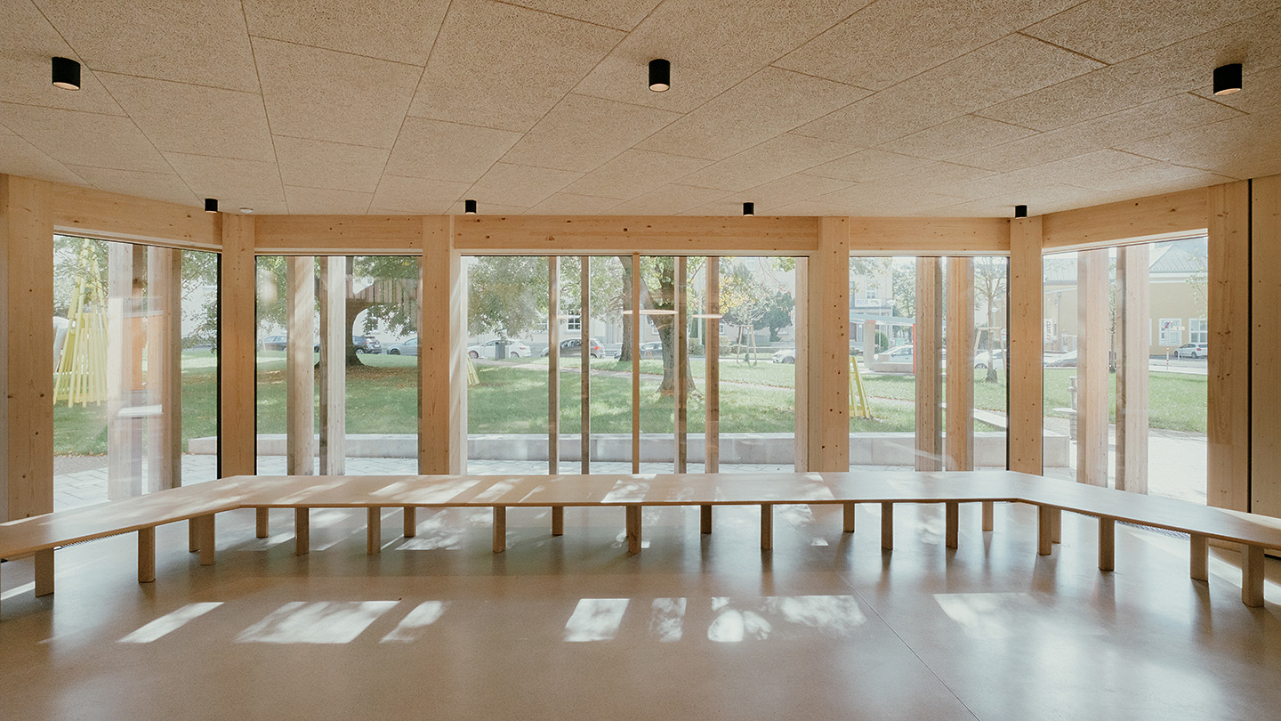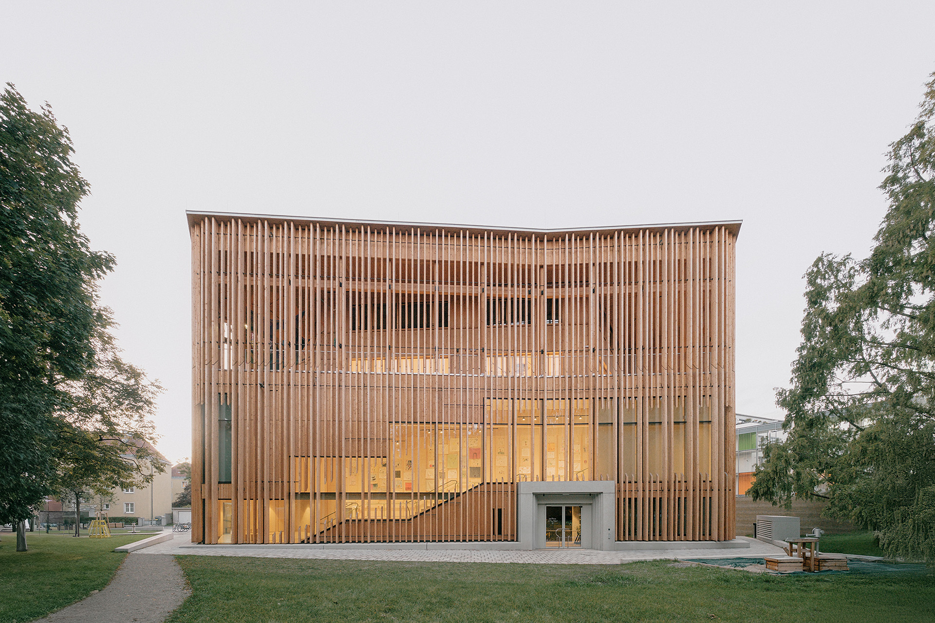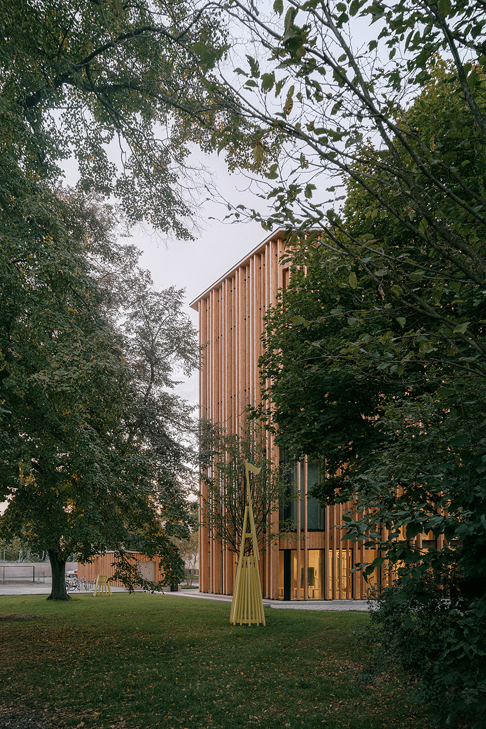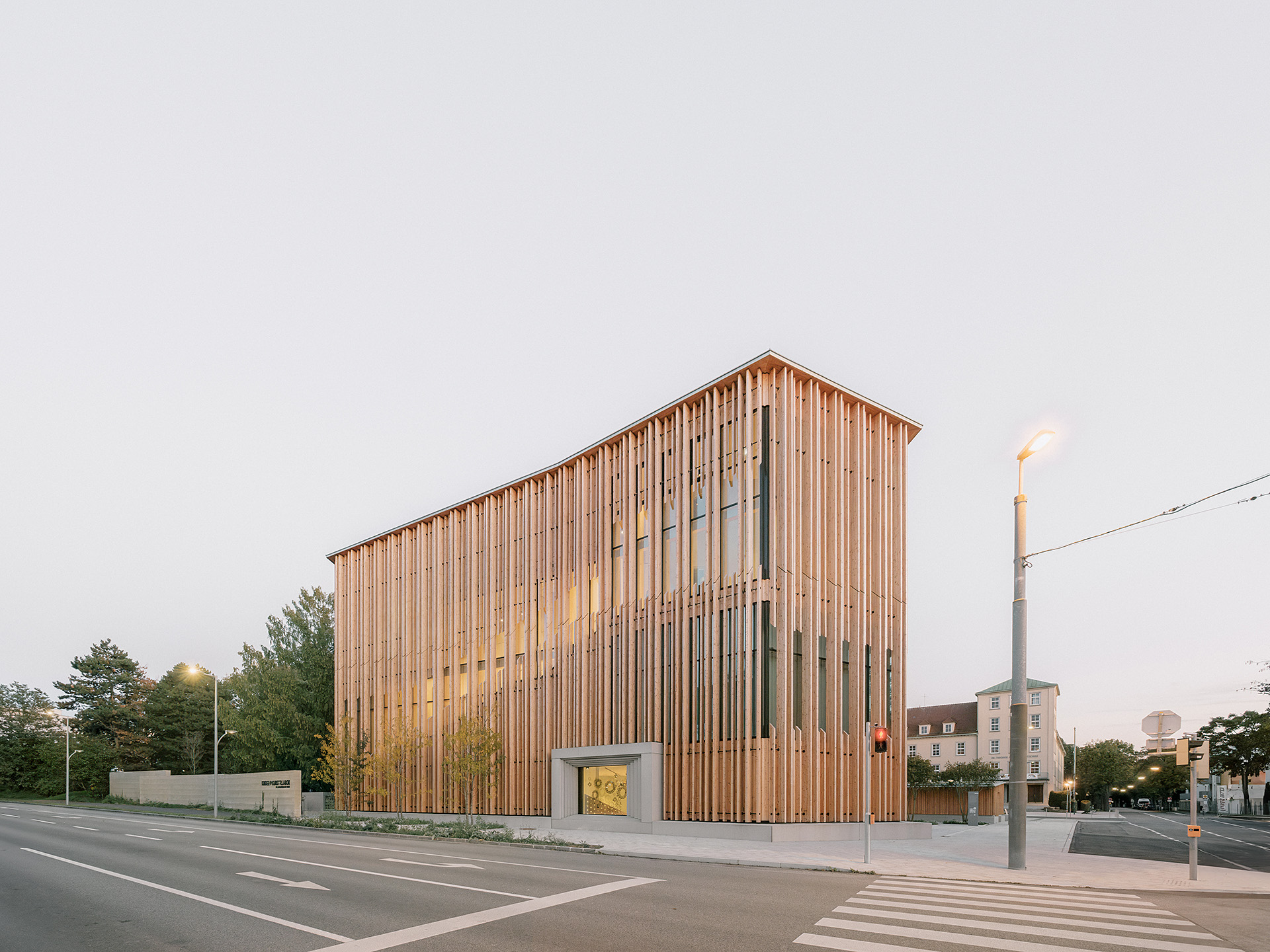 "Das Gebäude im Altoonapark agiert mit seiner prägnanten Form als Landmark auf dem Weg von der Altstadt zum Kulturbezirk in St. Pölten. Das Holztragwerk verleiht dem Bau Leichtigkeit und Offenheit." Schenker Salvi Weber