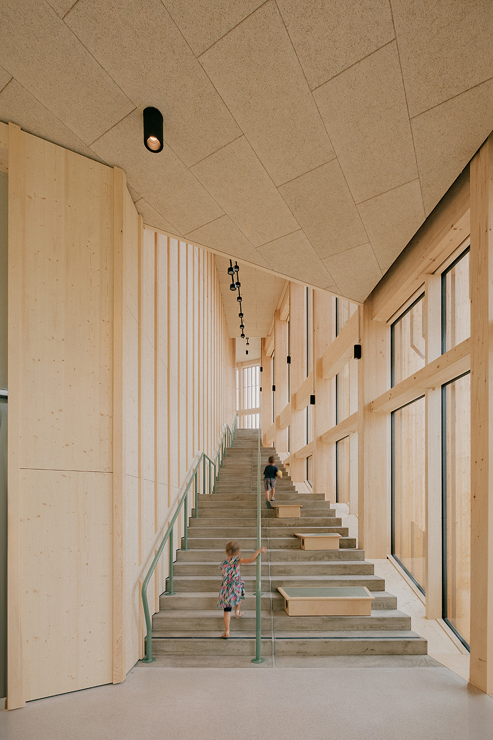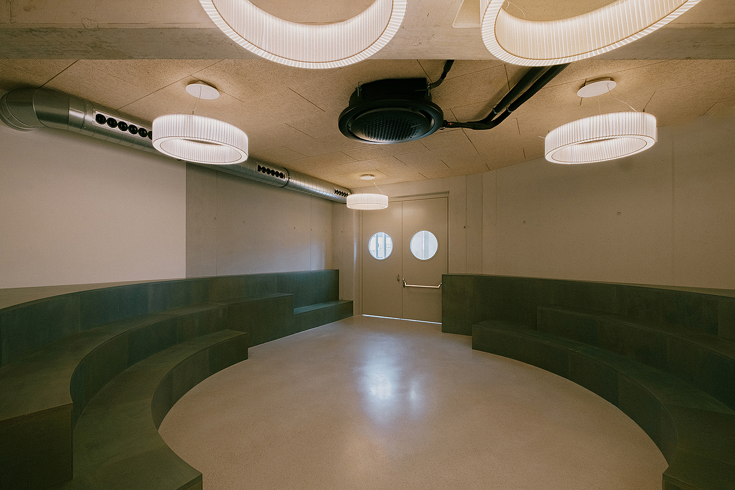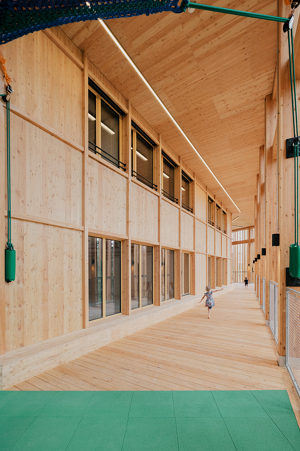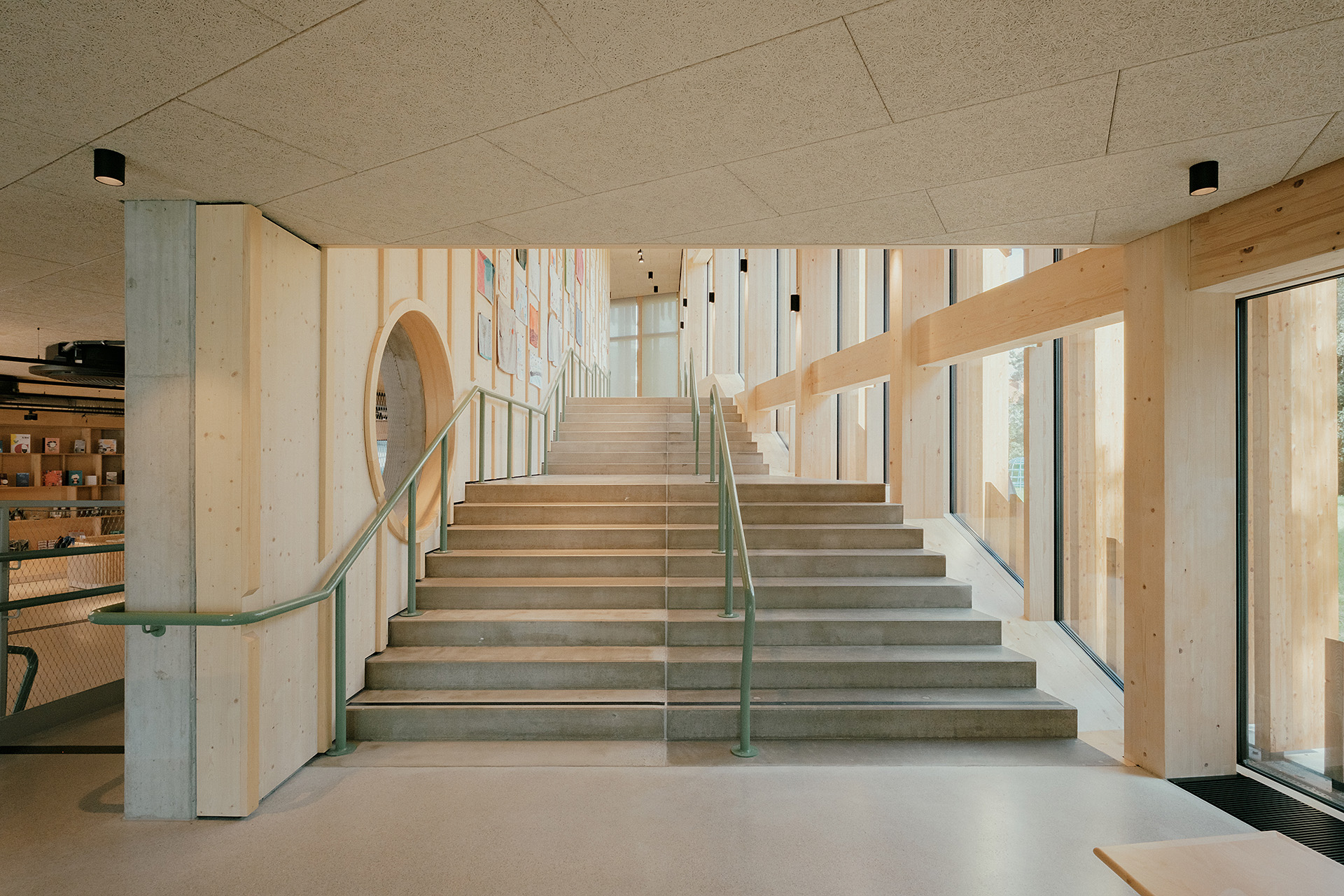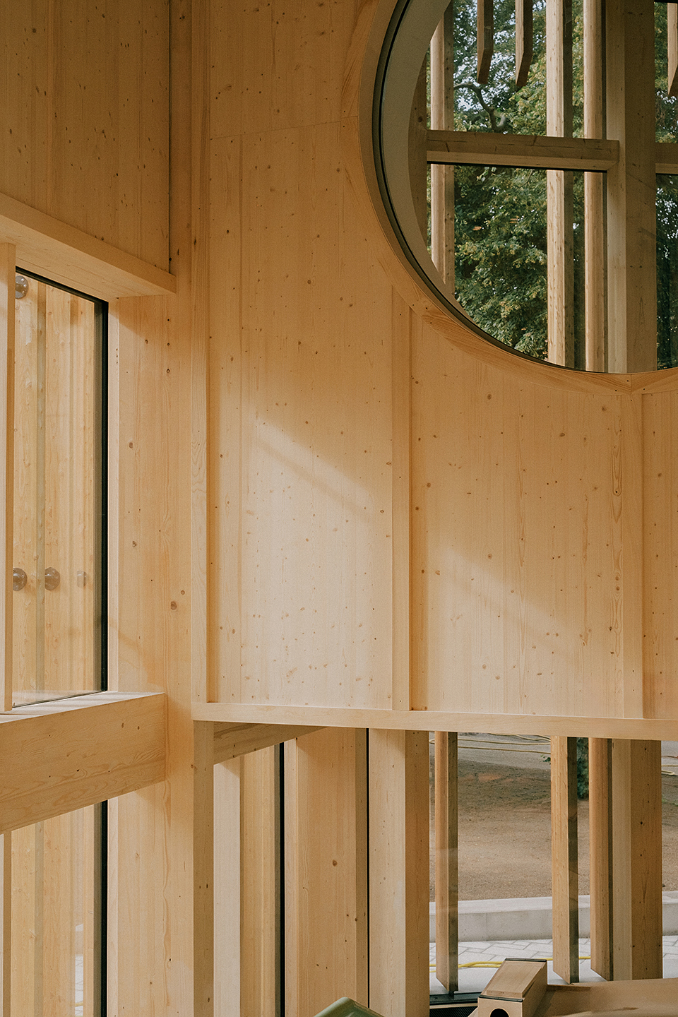 "Das Gebäude im Altoonapark agiert mit seiner prägnanten Form als Landmark auf dem Weg von der Altstadt zum Kulturbezirk in St. Pölten. Das Holztragwerk verleiht dem Bau Leichtigkeit und Offenheit." Schenker Salvi Weber