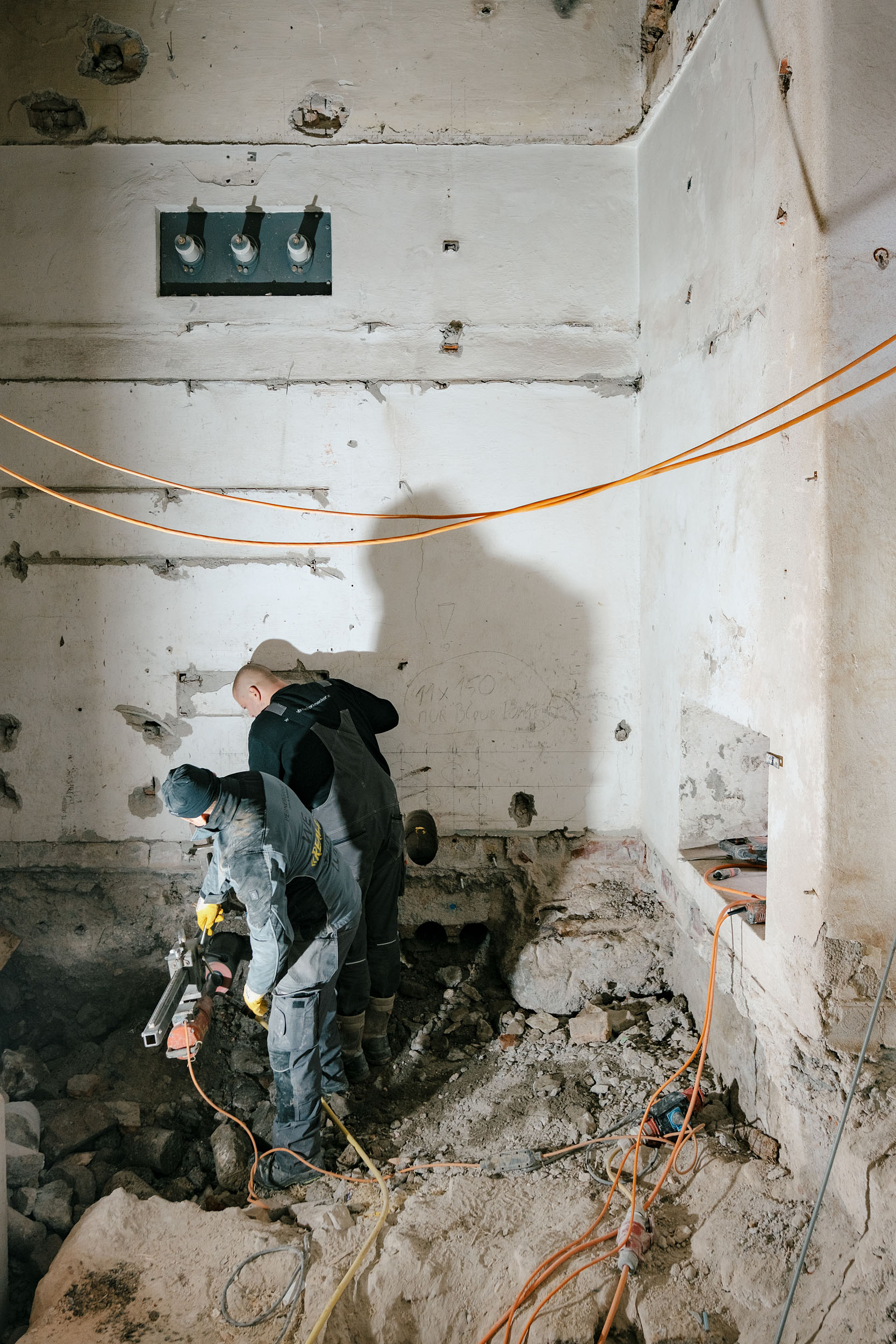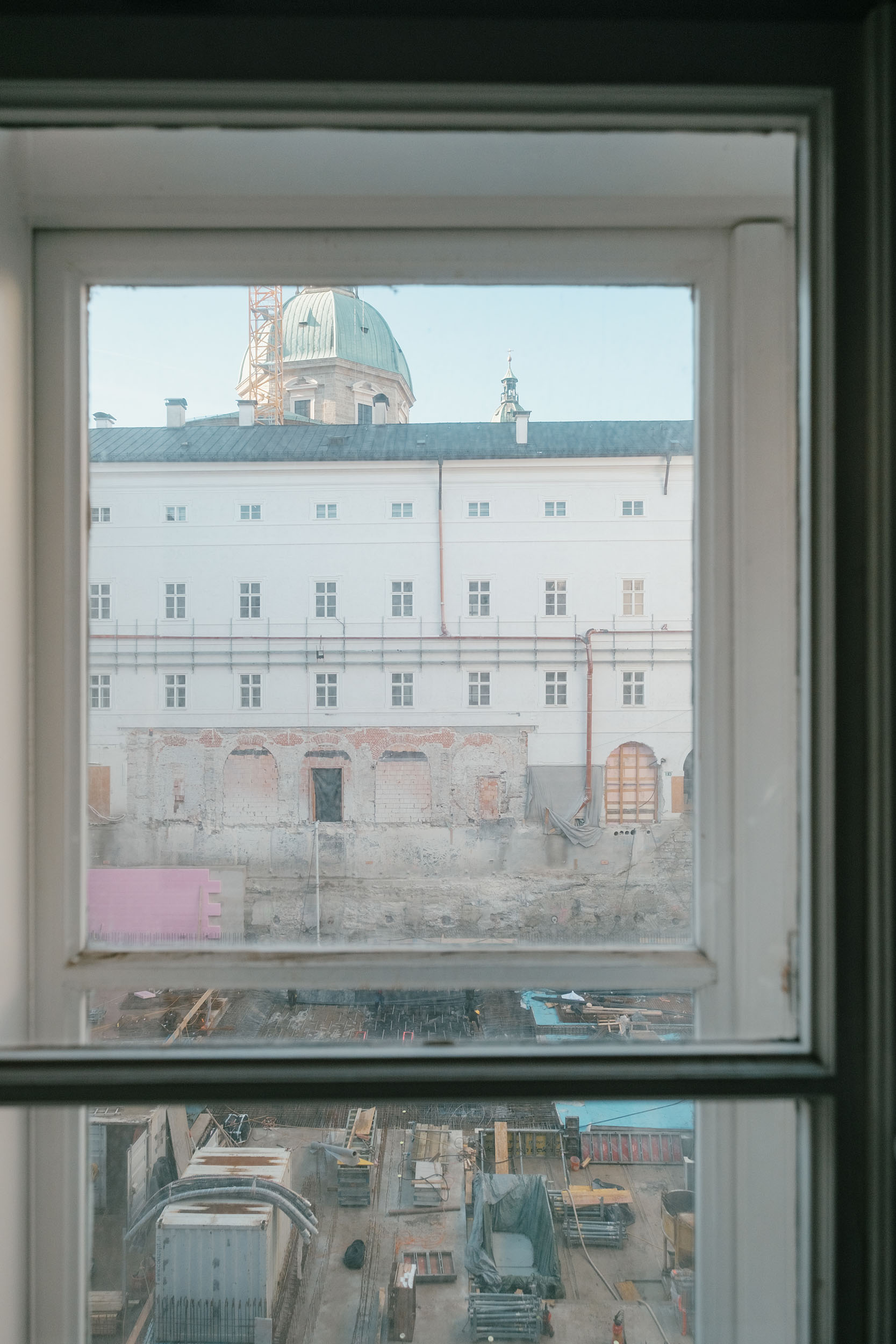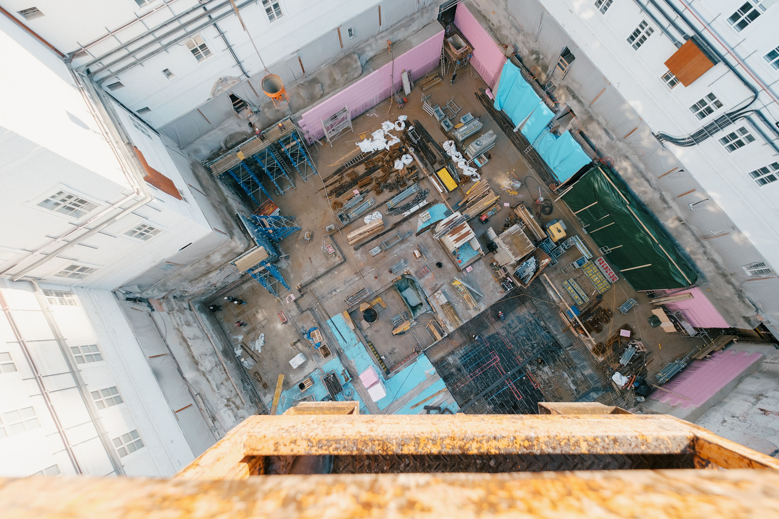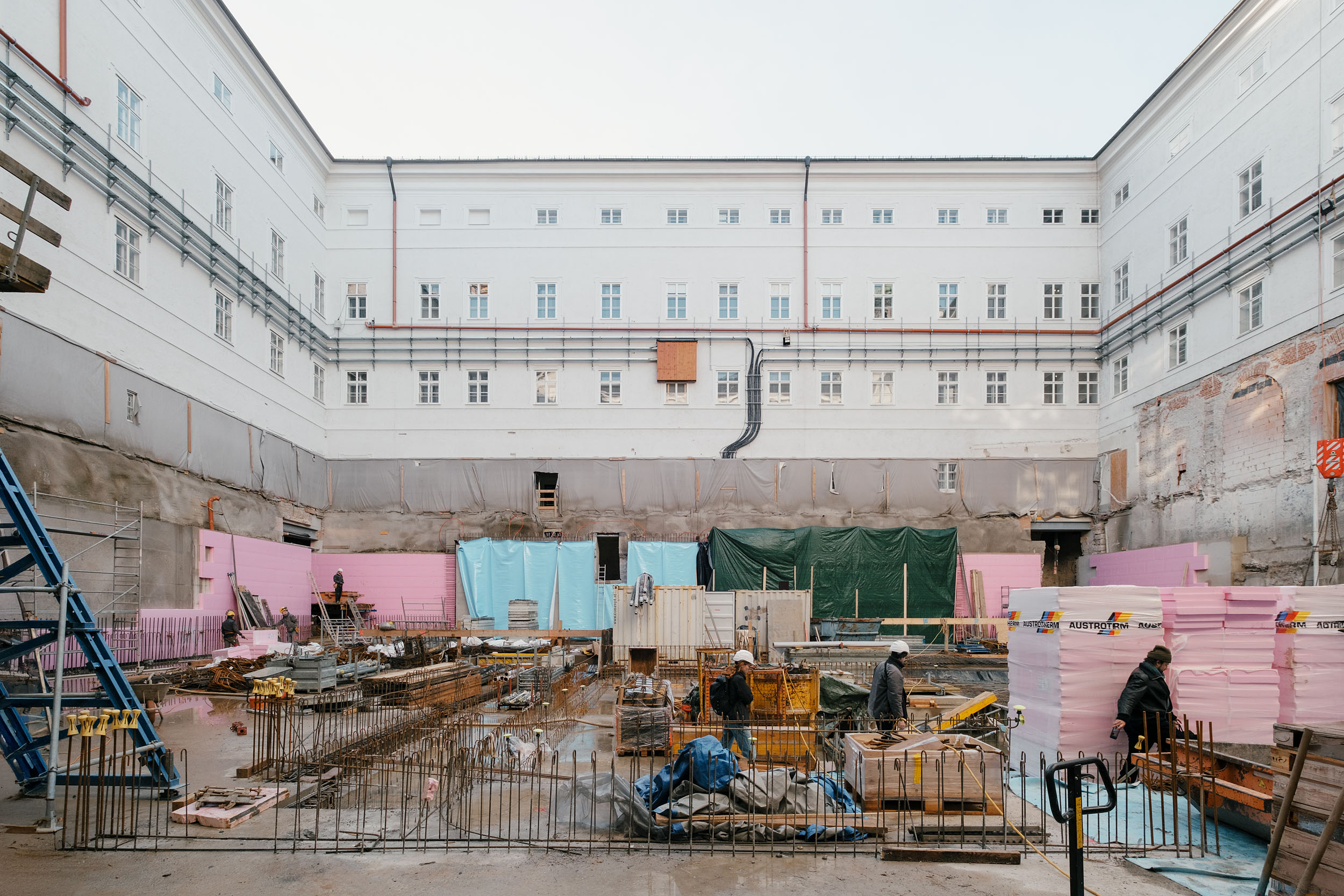 Baugrube und Rohbauzustand im Innenhof der historischen Neuen Residenz. Dokumentiert werden der Bestandsumbau und die Museumserweiterung. Der zukünftige Lichtbrunnen bildet das zentrale Motiv des Projekts, die neue Treppenanlage verbindet die Ausstellungsraeume mit dem historischen Bestand.